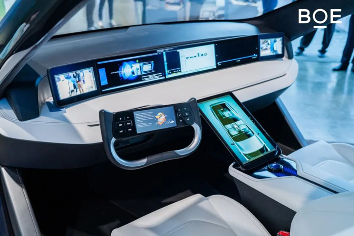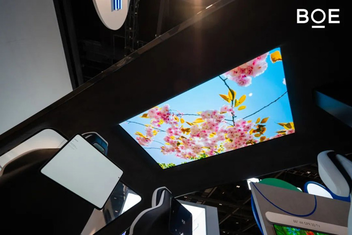 另外,在车载显示方面,京东方展示了全球首款智慧光幕技术车窗,搭载双曲柔性产品解决方案,采用大尺寸膜片,可解决车企天幕调光智能化需求。