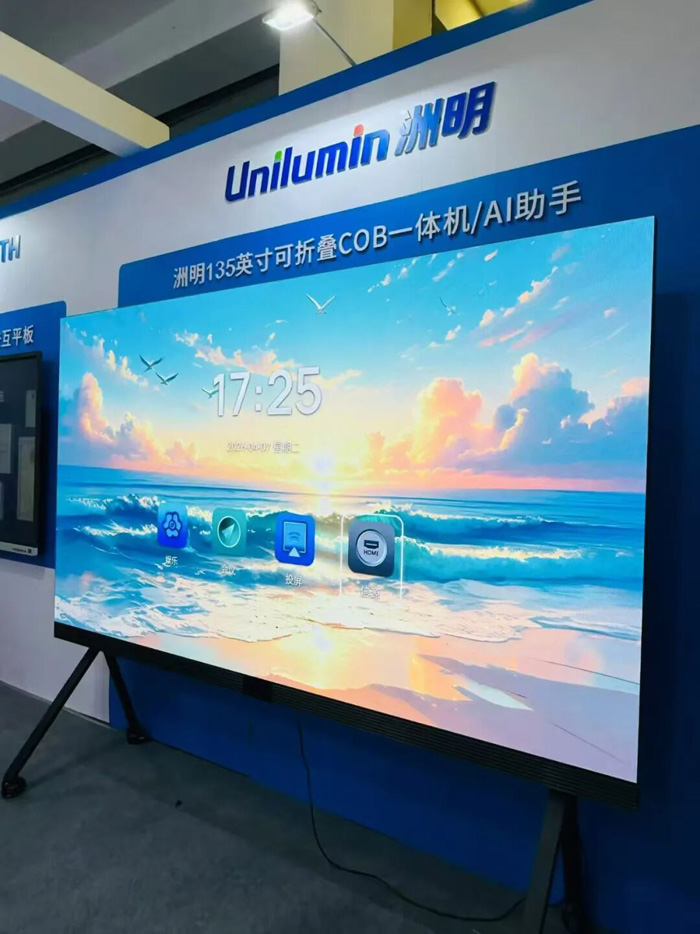 震撼的视觉冲击、无缝拼接的巨幕效果,让校园信息发布、大型活动、学术报告厅焕发全新活力。本次展会,我们隆重带来了 洲明135英寸可折叠超薄一体机——全球首发 的明星产品!它集可折叠、超薄轻便、高清显示于一身,彻底解决了传统LED运输难、安装繁的痛点,为教育场景提供了前所未有的灵活大屏解决方案。领导们亲临体验后,对产品的稳定性、色彩还原度及低蓝光护眼特性给予了充分肯定,尤其对“全球首发”的创新意义赞不绝口。