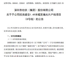 10 月 15 日,深圳市纺织 (集团) 股份有限公司(证券代码:000045、200045,简称 “深纺织 A”)发布公告,旗下子公司深圳市盛波光电科技有限公司(简称 “盛波光电”)拟在深圳坪山区投资建设 1.49 米幅宽偏光片产线(8 号线),总投资估算 13.34 亿元,规划年产能约 1800 万平方米,旨在缓解产能瓶颈,强化高附加值产品供应能力。 …详情>>