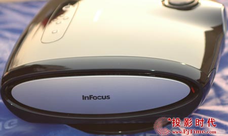 富可视IN76投影机顶部细节有白色“INFOUCS”的标示。顶部采取是弧线型设计,整体看起来觉得非常闪辆,透露出一种高贵与典雅的气息,从这款机子的外观的整体以及细节上的精心设计,可以看出富可视在这款投影机是花费了功夫的。