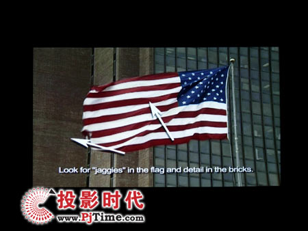 测试环境:我们将投影机设置恢复默认出厂设置,与台式机采用DVI-DVI连接,将分辨率设置为1024×768。试选择配备的1024*768的信号,使信号与投影机像素点一一对应,以求能达到最佳的效果。拍照选用了尼康D70S单反相机,快门1/125S,光圈2.8F,在暗室条件下拍摄。投影机成像距离约为2.2米,画面大小约60英寸,投影机采用桌面正投,且与屏幕中心正对,水平倾角接近0度,投影机其他参数选择默认值。由于测试过程中使用DC拍摄的效果与真实的视觉效果还有不小的差距,因此下面展示的图片仅供对比参考.