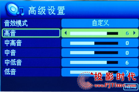 明基SH4231液晶电视音频高级设置菜单包括音效模式、高音、中高音、中音、中低音、低音六项,其中音效模式包括通俗、爵士乐、摇滚乐、自定义、古典五种可选模式,如果用户想对高音、中高音、中音、中低音、低音进行调节,必须在自定义模式下才能操作。