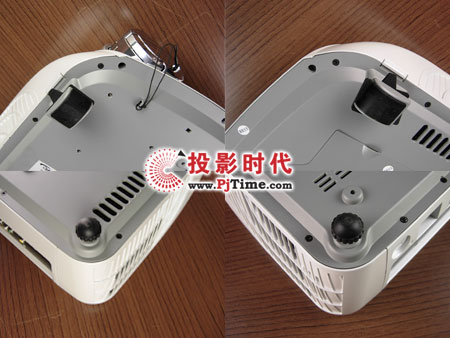 投影机的底部相对其它面来说要“平坦”得多,除了四角的支架外就没有什么特别显眼的凸出部位了,在HD80投影机的底部也分布了几个大小不等的散热进风口。