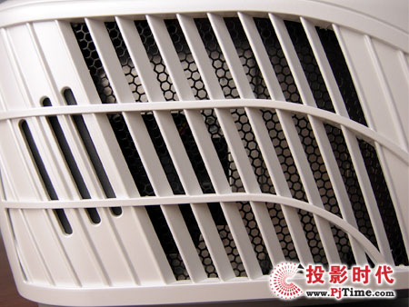 在投影机的出风口设置在右侧,其外层的窗叶采用了斜线设计,热空气排出时就会根据窗叶的开口方向吹去,这样就可以避免热空气向前排而对空气产生膨胀使投影画面产生细微的变形,由此我们可以看出奥图码HD80投影机的设计师在设计时所考虑的周到性。