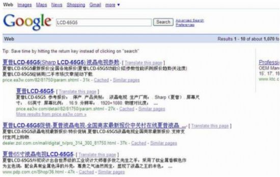 通过与在中国大陆“独售”夏普LCD-65G5对比不难发现,在配置上LC65D93U比LCD-65G5要高出不少,而价格仅是LCD-65G5液晶电视的42%,如此大的差别不由引发夏普歧视大陆消费者的联想。笔者调查发现,在夏普日本网站上并未发现型号为LCD-65G5的液晶电视,而用google英文搜索一下“LCD-65G5”,搜索结果也全部是中文网页