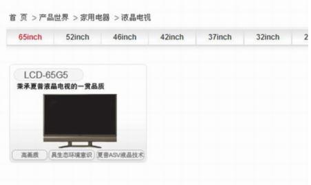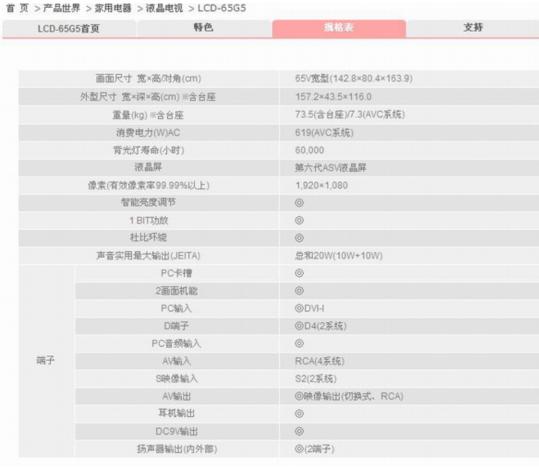 夏普中国网站在大陆仅推出一款型号为LCD-65G5的65英寸液晶电视
