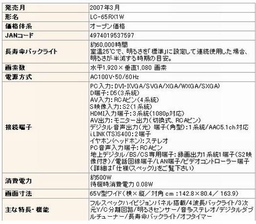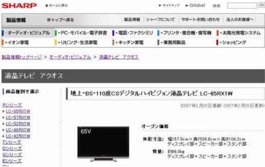 截图清晰的显示,夏普LC-65RX1W液晶电视上市的日期是2月20日,正式登陆日本市场的时间是2007年3月