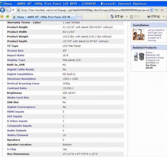百思买网站公布的夏普LC65D93U液晶电视参数