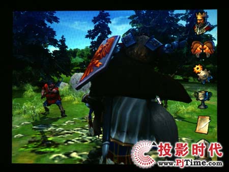 爱普生EMP-DM1投影机的电脑游戏效果采用电脑VGA接口连接,测试游戏采用“英雄无敌5”。电脑显示分辨率为1024*768,投影机采用居中显示的方式显示画面,屏幕有效分辨率为640*480。