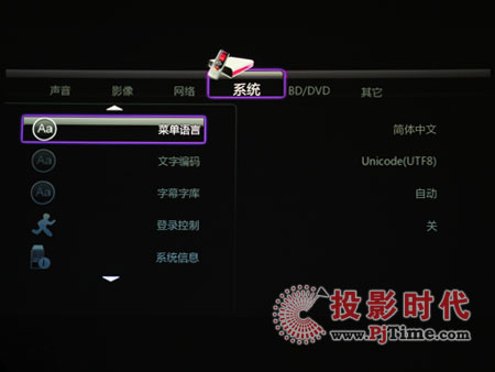 系统菜单提供了菜单语言、文字编码、字幕字库、登陆控制、系统信息、电影分级、硬盘格式化、恢复默认值等选项。
