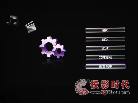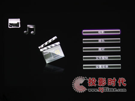 主菜单提供了电影、音乐、图片、文件复制、设置菜单共5个子菜单。