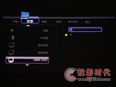 影像子菜单提供了屏幕比例、亮度、对比度、噪点抑制、电视系统、1080P 24Hz等播放设置选项。
