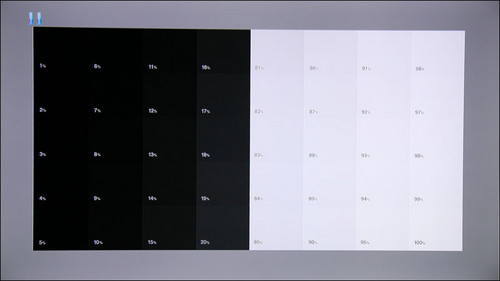 首先是15梯度灰阶测试,从实际画面表现来看,各灰阶之间较容易分别,其中1、2梯度黑色表现区分比较细微。