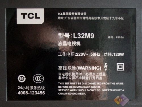 产品背后的铭牌上标注了TCL 32M9液晶电视的一些产品信息,它的基本功耗为120W,遇到问题,还可以拨打上面的24小时服务热线4008-123456进行咨询。