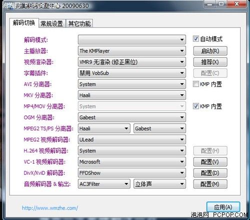 安装完美解码最新版本之后,首先打开“完美解码设置中心”程序,找到H.264视频解码器,将解码器设置为CoreAVC(如上图),这样就调用了CoreAVC 1.9.5版本的解码器。