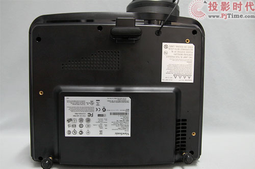 优派PJD7383i互动投影底部也有散热孔设计,用于吊顶的螺丝孔也进行了预留,使用了三活动脚设计,即稳定又能适应复杂的摆放环境。白色的标签为此机的型号、参数和警告注意事项等。
