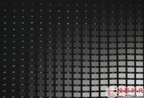 在256灰阶测试中,优派PJD7383i互动投影的对比度表现还是非常不错的,各色阶块之间都有渐进的明暗变化,最难能可贵的是,这256个灰阶都能用肉眼轻松的区分出来。3500:1的对比度、2700流明亮度表现优秀。