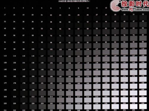 256灰阶的投影测试中,虽说中光学T605商务投影机只有2300:1的对比度,但实际测试的表现没有让大家失望,展示出了非常不错的对比水平,相邻方块都能轻易区分出来,完全能满足商务应用需要。