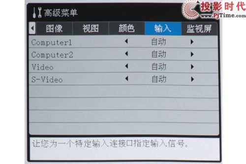 在初级菜单下,首先能过见到的是输入选择项菜单,信号源可以手动或自动的选择操作。分辨率数字波浪状显示,可以让用户看的更清楚,这也是中光学T605商务投影菜单其中一个显著特征。