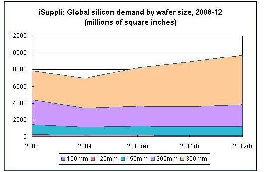 iSuppli:2008年至2012年,全球不同尺寸半导体硅片市场需求量状况
