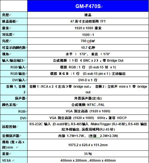 GM-F470S 拥有独有的47英寸液晶显示屏(比普通46寸显示屏大10%),它采用FHD 高灰度IPS面板,具有 宽视角、对比度高特点,拥有700cd/m2高亮度,16:9的1080P全高清分辨率,同时适用于高清电脑、高清视频型号及其他信号,拥有独有的全金属外框、人机设计、坚固耐用、专为7X24小时工业运行而设计。