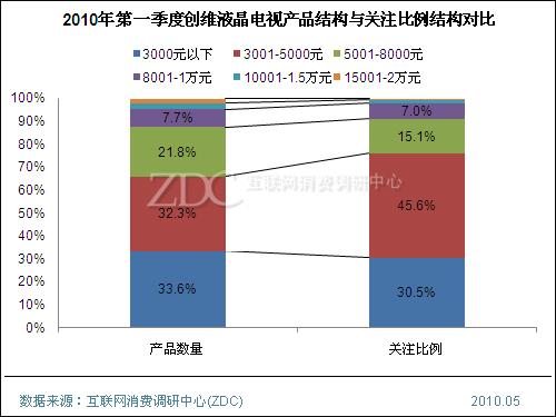(图)2010年第一季度中国液晶电视市场产品结构与关注比例结构对比