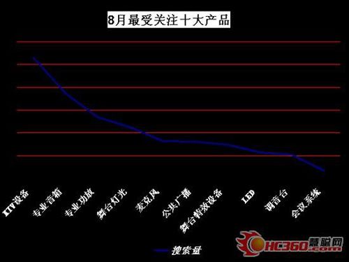 从上图可以看出,8月份最受关注的十大行业产品依次为:KTV设备、专业音箱、专业功放、舞台灯光、麦克风、公共广播、舞台设备、LED、调音台、会议系统。与7月份相比,KTV设备、专业功放、麦克风、舞台特效设备等产品关注度提升。