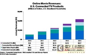 根据Parks的估计,已经安装宽带网络的美国家庭中,今年会有5%购买网络电视,总数量约在400万台;此外连网蓝光光驱(Blu-ray player)也会有约600万的销售量。“今年售出的HDTV中,会有超过三分之一的连网机种;连网蓝光光驱则是占据七成五比例。” 今年上半年,Sony与Samsung是网络电视市场的领导品牌,市占率分别为23%与20%;LG、Vizio与Panasonic排名在后,市占率各约9%左右。至于专门用以链接家用电视与PC的设备,今年销售量估计可达600万台;这些设备主要是使用Wi-Fi类的技术,不过至少有两家公司的产品是采用 UWB链接技术。 Scherf指出,在美国,通过消费性设备观看的在线电影销售额,今年估计可达到7亿美元规模,到2014年甚至可超过50亿美元;该市场目前与规模达数十亿美元的DVD零售业务相较,仍是小巫见大巫,但有越来越大的趋势:“DVD不会消失,但势必会变成辅助;在线视频会慢慢取代DVD零售店。”