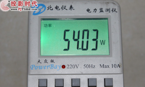 说是六种模式,上面已经测试过了3种,那应该还剩三种需要测试。但这里只出现了标准一种的功耗,其实另外的KTV、演示模式也有测试,只不过和标准模式的功耗值一样而已。所以。54W是标准、KTV、演示模式下的实测功耗。他们比产品标称的48W功耗高了6W,不过节能的效果是毋容置疑的。