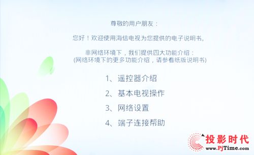 如果你还有一些地方不会操作,不要着急,只要在菜单栏界面上找到“电子说明书”图标,进入观看使用手册,就能帮你解决实际使用问题,电子说明书将怎样使用电视的步骤写的很详细,即使老人观看,也能快速读懂。