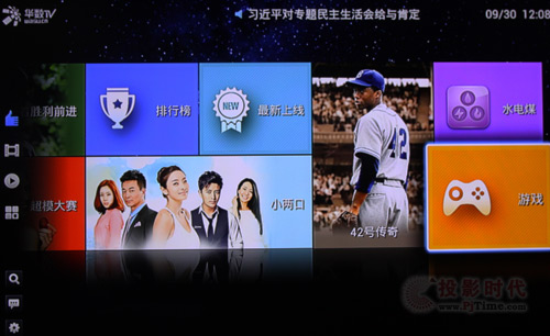 华数盒子最有看点的地方除了应用栏之外,就属点播栏了。在这里,用户能够看到众多的高清电影、连续剧、动漫、综艺节目、新闻和晚会实录等资源,纵横国内外,只有你没看过的,没有你不想看的。以下是投影时代网评测室对点播栏中观看影视的实拍图赏。