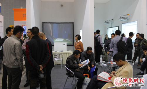 凭借良好的市场美誉度及多项专为教育量身打造的投影应用方案吸引了大量观众驻足、咨询。其中超短焦互动教育解决方案非常引人注目,它用1台液晶超短焦投影机、82寸的挂墙白板及几张课桌构成一个简单的模拟教室,让观众还原了一个真实授课现场。该解决方案最大优势是投影产品可在19.5CM距离内投射出80寸高清大画面,避免教师授课时光线直射对眼睛造成伤害,从而书写完美板书与学生进行智能终端互动教学,营造轻松而富表现力的趣味课堂。