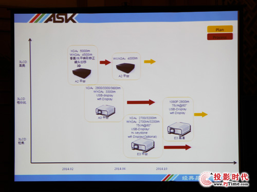 除此,在北京巡展会上,ASK中国区销售总监杨俊还公布了2014年新品规划表。明年主攻产品线为长焦商教机、短焦机及工程投影机。将在第一季度推出中端工程投影机,产品亮度在4500流明至5000流明之间,分辨率则分为XGA和WXGA,特点包括镜头位移、支持3D功能。在第二季度,将会推出C3系列的升级版,亮度范围从最低2800流明至3600流明之间,分辨率同样分为两种XGA和WXGA。产品特点包括支持USB、display、无线功能。|