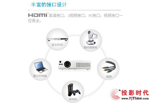 在接口方面,ASK C2320W主要是针对商务教育领域使用,所以包括了常用的2VGA接口,复合视频、S-视频与音频接口,并配备了RJ45网络控制接口,使得ASK主流商务机型(高亮C系列)可以通过局域网方便快捷的远程开关机、远程设置投影机参数等操作,甚至可以随时查询投影机灯泡使用时间、实用状态等信息。并且同时配备了HDMI接口,用户可以轻松实现高清显示。