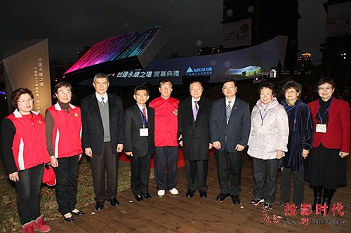 2013台湾灯会最亮眼的“台达永续之环”举行开幕仪式,台达集团创办人暨荣誉董事长郑崇华(右五)、台达电子董事长海英俊(左三)、政务委员杨秋兴(左四)、新竹县长邱镜淳(左五)、观光局副局长张锡聪(右四)、天下杂志群创办人暨董事长殷允芃(右三)、书法家董阳孜(右二)等贵宾合影。