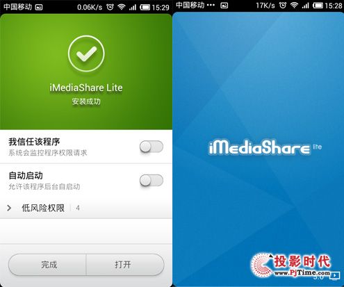 在使用时,需先打开G3S内置的应用软件Telechios,方可与安卓手机连接。通过iMediaShare软件选择用户所想分享的媒体内容,如视频、照片和音乐等就可直接从美高光电G3S上进行投影演示。无须任何连接线就可直接将手机内的内容放大数倍进行投影与朋友之间分享。
