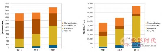 如果是以技术的角度分析智能手机与平板电脑面板的出货趋势,两个应用市场的面板技术趋势有些许不同。a-Si TFT(非晶硅)是两个应用市场面板最主要的技术,但是在平板电脑面板使用a-Si的比重稍高于智能手机;2013年平板电脑面板使用a-Si技术的比重超过90%,而智能手机预估接近50%使用a-Si的面板,造成这差异的主要原因为分辨率。预估2013年智能手机面板PPI(Pixel in Per Inch)在250以下的大约占所有智能手机面板的50%,而同时250PPI也是a-Si与LTPS及其他技术的门坎。然而在平板电脑的面板市场中,预估2013年250PPI以下的面板占所有平板电脑面板的比重超过80%,由于成本与供给需求的多项原因考虑,大部分品牌与面板厂在平板电脑选择以a-Si为主要面板的技术来源,虽然LTPS与AMOLED拥有更好的画质表现,同时LTPS能耗更低,但是平板电脑的市场价格定位以及对于成本的要求,LTPS与AMOLED的比重并未在平板电脑市场明显增加。