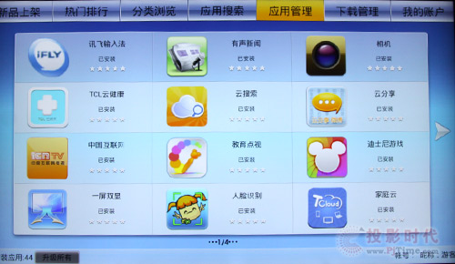 免费资源丰富也是TCL L55V8500A-3D电视的一大特色,而且延续了以往的风格,支持TCL应用商店功能。在TCL应用商店中,我们可以遍寻到内容丰富的各类软件。同时,为了方便用户操作,该机还对相关应用进行了分类,譬如有新品上架资源、热门排行、分类资源、应用搜索等等。