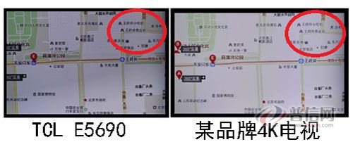 上图为1080p分辨率的百度地图细节实拍图分别在TCL E5690 4K电视和某品牌4K电视上所呈现出来的实际效果,请大家注意图中红圈标注的地方,并根据标注到下面的大图中找到相应的位置。