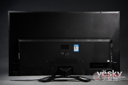 康佳易TV 9800这款电视背部为黑色,外壳为工程塑料制成,可以看到背部有很多散热栅格,利于散热。背部中间是机身标签、节能标签,电源线与开关位于左边,接口、机身按键位于右边。