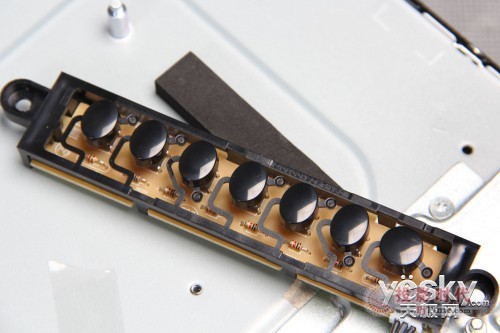 电视的机身功能按键则位于另一边,如下图,按键下方有起缓冲作用的海绵垫,保护机身和按键。
