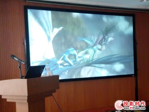 发布会现场的正前方使用AFlex5D-5型号机器将两台投影机画面堆叠到一起,搭配亿立3D金属幕,播放2D片源时能将两台投影机的亮度叠加,即使是在白天或开灯的情况下也能保证投影画面足够的亮度,使参会人员能看到演讲者的文案;播放3D片源时,加装偏光片,戴上被动3D眼镜,就能体验到比主动3D更加健康、环保的不闪式3D立体效果。