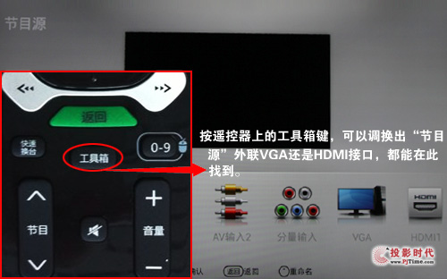 相信很多用户都知道电视机可以外接高清播放器等设备,显示外接设备中的图片、影视、软件或者文字资料等信息。这款长虹电视的遥控器上设有“工具箱”键,用户可按此键,进入节目源选择项,进行页面调整。