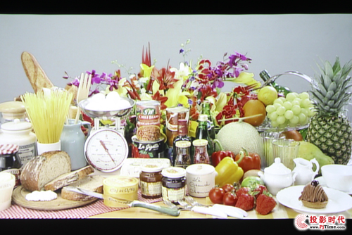 图片测试时,画面的效果在明基DX806ST投影下,人物的肤色表现比较自然,鲜花与蔬菜水果的颜色还原不够到位,色彩偏冷。但画面清晰,标准模式下的画面亮度观感也很舒适。此外,由于高亮,其投影的地球及咖啡图,暗处细节依然清晰可辨。