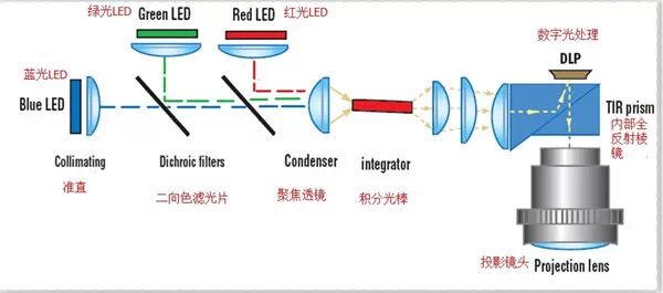 最后,DMD反射出的图像通过光机及超短焦镜头投射到主机的反射镜上,反射镜将屏幕图像反射到屏幕上,再经屏幕反射后形成完整图像,进入到人的眼球。不同颜色的图像经过人眼的暂存效应,使得人眼看到彩色的图像。