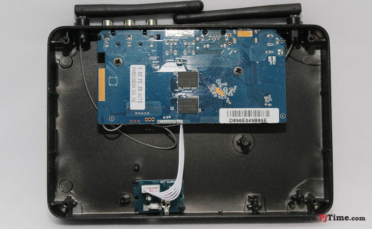 开博尔H19智能盒子出色的性能表现除了依托于系统方面的优化之外,强大的硬件支持也是不可或缺的一环,拆开机器后我们可以看到开博尔惯用的蓝色PCB板。