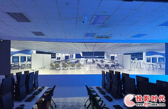 为了保证授课环境安全,美观,并能直观生动地表达授课内容,天创结合项目特点,采用4台日立TCP-070U工程投影机,结合日立USL-901 超短焦变焦镜头进行镜面一次反射背投拼接融合投射至12米X2.2米弧形屏幕,作为教研使用。