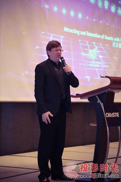 此次论坛,赢康公司常务副总杨英俊先生就“主题乐园中的视频、音频和控制”这一主题发表演讲。演讲主要介绍了音视频系统在主题乐园的作用,以及系统、显示、音效、控制等子系统组成。同时杨总就主题乐园音视频系统设计、投影系统设计等进行了介绍,突出科视投影机在大型主题乐园的优势以及赢康在文化娱乐领域的产品和技术实力。