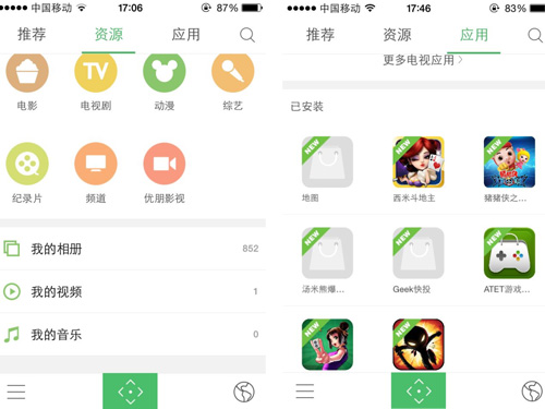 手机安装电视派成功,打开手机UI可看到“推荐”、“资源”“应用”三大栏