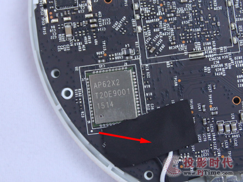 天猫魔盒2的顶盖采用了双层顶盖设计,最外层工艺顶盖采用无螺丝暗扣设计,内顶盖采用螺丝加暗扣双重设计。外顶盖与内顶盖除暗扣结合之外,我们可以通过图片中箭头标注的位置看到在顶盖面上还有两道双面胶以用于两个顶盖之间的加强结合。在一个产品中使用双面胶来粘合是天猫魔盒2在工业设计上的一大败笔,给人一种山寨的感觉。